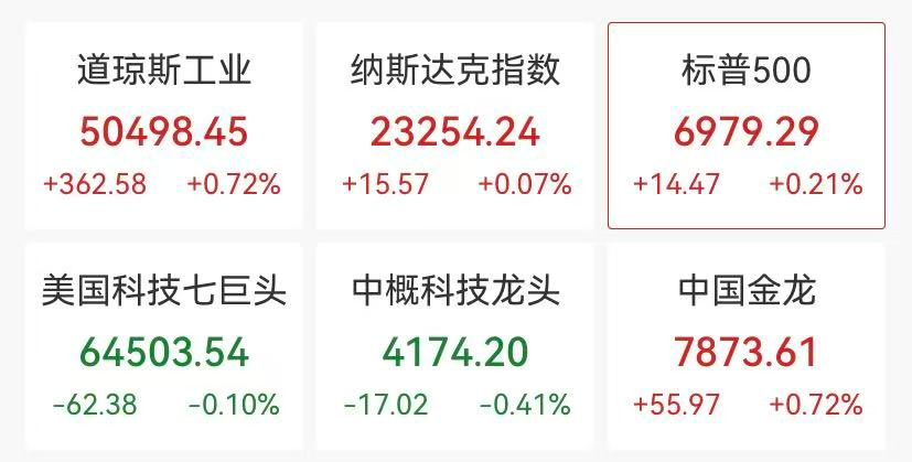 明星科技股多数上涨。七巨头方面,微软涨超2%,亚马逊涨超1%,特斯拉、苹果小幅上涨,谷歌逆势跌超1%。
