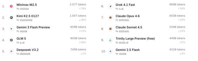 MiniMax推出M2.5,主打高频Agent场景。官方数据显示,其推理速度最高达100tokens/s,连续运行1小时成本约1美元。OpenRouter页面显示,M2.5累计调用量达到2.83万亿tokens,一度位居榜单前列。