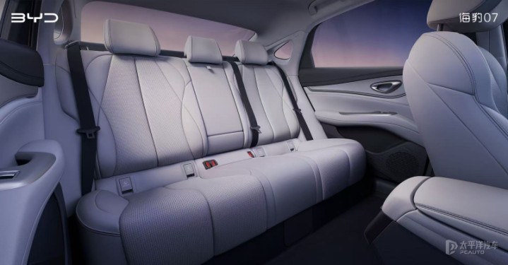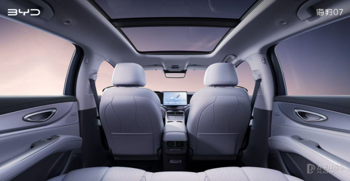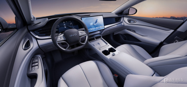 进入车内,海豹07EV的内饰采用简约现代的设计语言,整体以浅色调为主,搭配深色饰板与金属饰条点缀,营造出开阔、清爽的座舱氛围,设计风格与海洋网系列的家族化定位相契合。